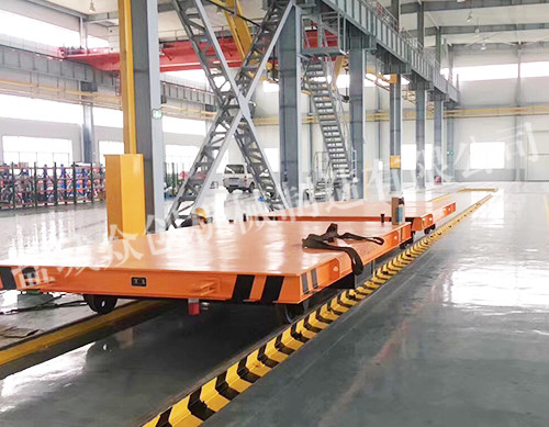 KPD系列是36V單相(三相)低壓軌道供電電動(dòng)平車,以軌道滑觸線供電。地面降壓變壓器控制柜將單相(三相)交流380V降壓至單相(三相)36V,經(jīng)軌道滑觸線饋送給平車,再經(jīng)車載升壓變壓器升壓為單相(三相)交流380V。給平車用單相電容電機(jī)提供電力(三相時(shí)為YZ起重冶金用電機(jī))。由于不用電纜,故安全可靠、不怕燙,不怕砸,不妨礙交叉運(yùn)輸,易實(shí)現(xiàn)遙控和自動(dòng)化,給廠區(qū)運(yùn)輸布置以很大方便。但其軌道施工要求較高,須保證軌道絕緣,超過一定的運(yùn)行距離時(shí)軌道應(yīng)加銅排補(bǔ)償線。運(yùn)行距離較長時(shí)還必須增加降壓變壓器個(gè)數(shù)。